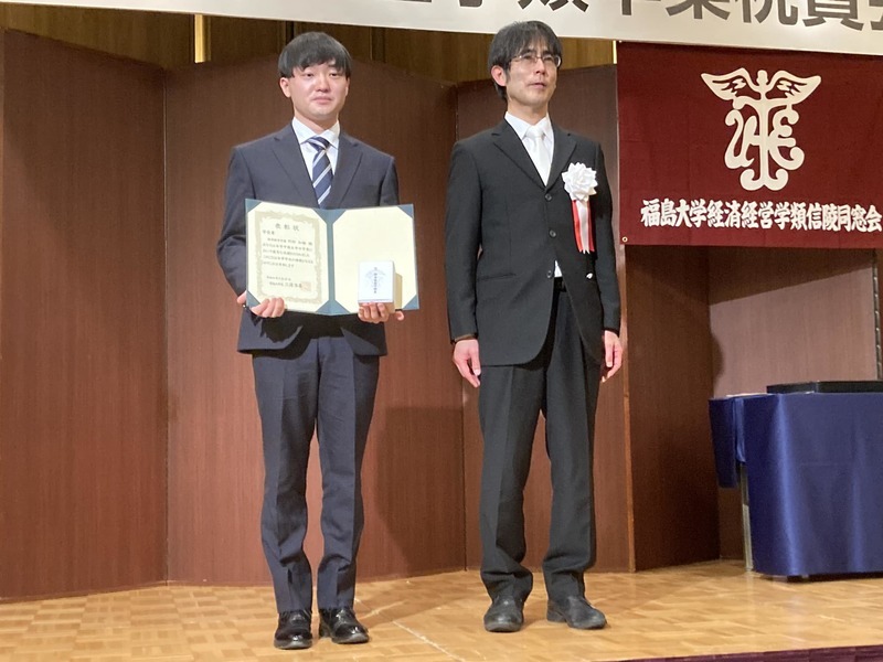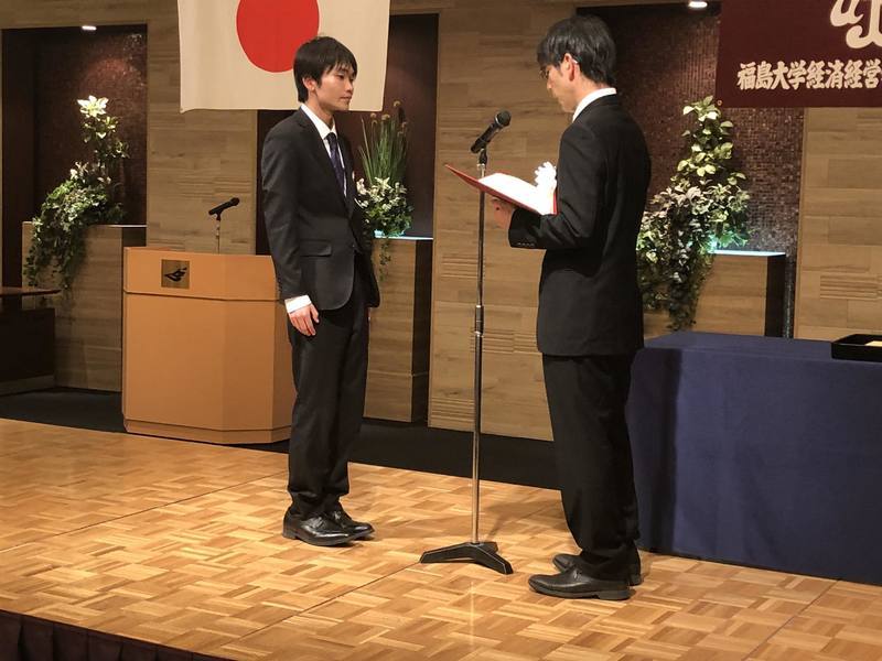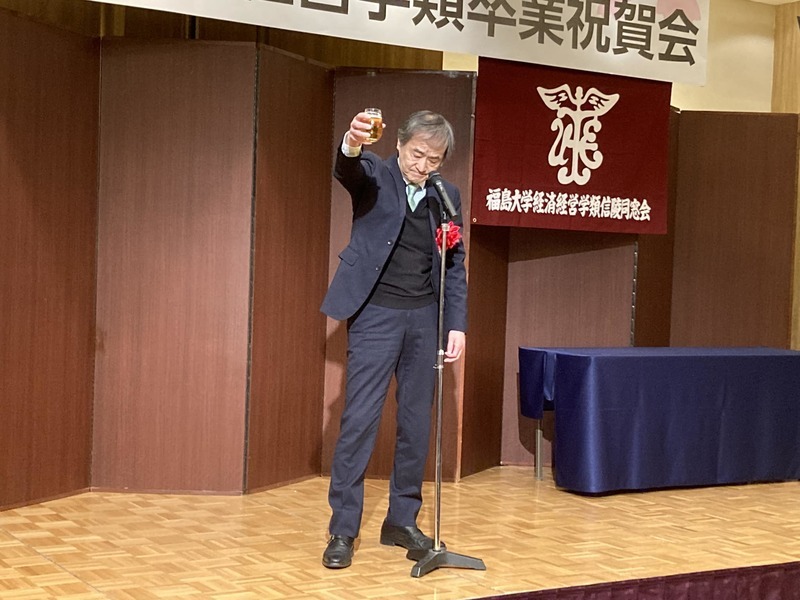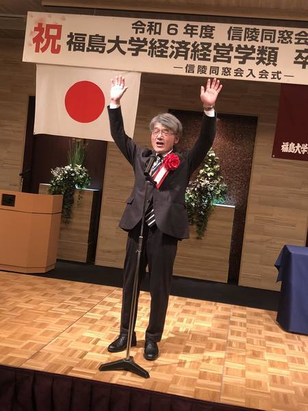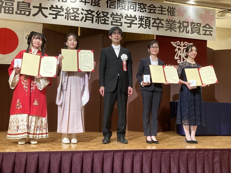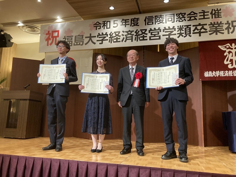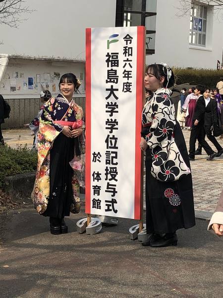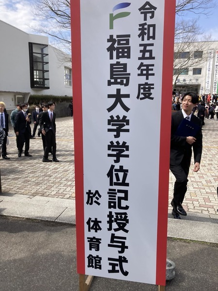 令和6年3月25日、令和5年度の福島大学学位授与式(卒業式)が開催されました。東京信陵会からは鈴木恒雄会長、鈴木周平事務局長、岩倉さんと田畑の4名が福島へ赴きました。第1体育館での式典終了後に各人への学位授与がL棟教室で行われましたので、岩倉/田畑の2名で信陵論叢と信陵同窓会主催の祝賀会パーティの案内状と東京信陵会から持参した「東京連絡事務所」の案内と「新歓ウォーキング」のチラシ、およびQRコード付きの名刺を卒業生全員に配布しました。祝賀会パーティでは4名で東京へ就職する卒業生に6月22日の総会に来てほしいと案内をしました。
