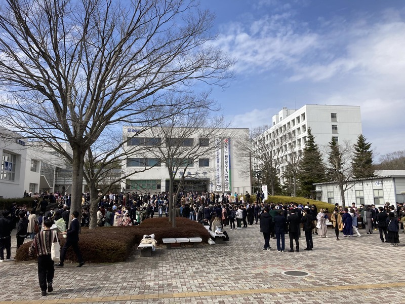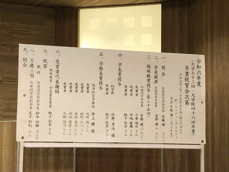 令和7年3月25日、令和6年度の福島大学学位授与式(卒業式)が開催されました。東京信陵会からは鈴木恒雄会長、鈴木周平事務局長、岩倉さんと瀬川さん、田畑の5名が福島へ赴きました。第1体育館での式典終了後に各人への学位授与がL棟教室で行われましたので、岩倉/田畑/瀬川の3名で信陵論叢と信陵同窓会主催の祝賀会パーティの案内状と東京信陵会から持参した「東京連絡事務所」の案内と「新歓ウォーキング」のチラシを卒業生全員に配布しました。祝賀会パーティでは5名でQRコード付の名刺を配りつつ、東京へ就職する卒業生に5月24日の新歓ウォーキングと7月5日の総会に来てほしいと案内をしました