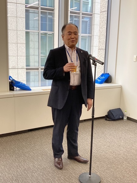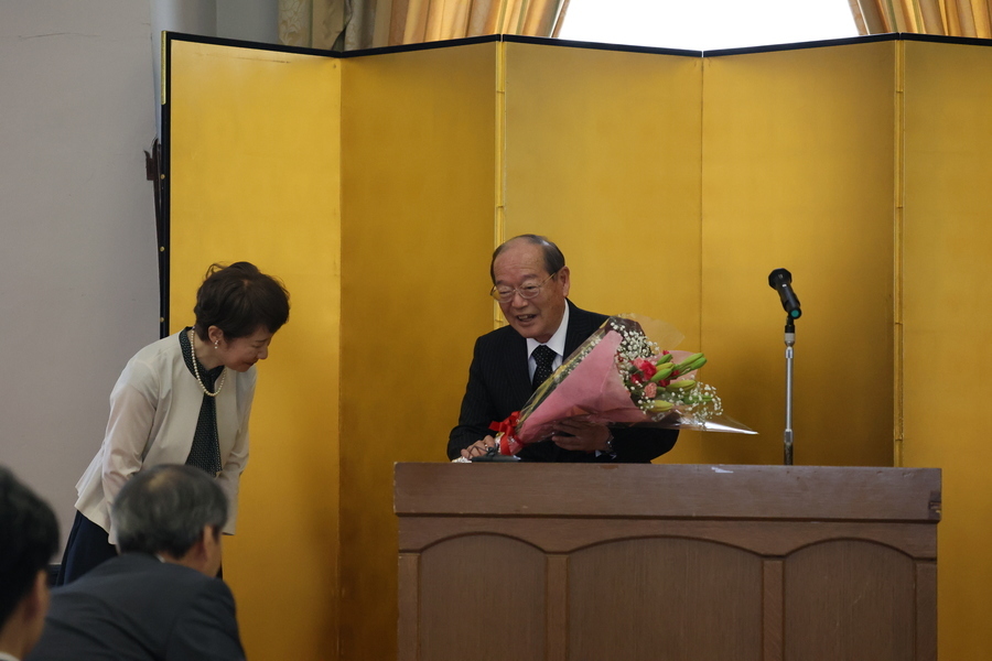 三浦学長の講演と斎藤事務局長の乾杯、じゃんけん大会の勝者記念撮影。