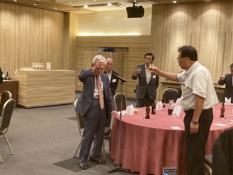 4) 最後に加藤孝雄君から「体調が完璧でない方も今日、出席してくれた。厚くお礼と感謝を 申し上げます。かたや、体調不安や療養中の同期生も増え、今後も増えてくることでしょう。 同期仲間は永遠で 何でも語り合える友人 ! 永遠の友情を育もう ! みんなと同期であれたことが誇り ! ステキな絆を続けよう !! お互い健康に細心の注意を払い 一瞬一瞬を大切に、やり残したことがない様に、明るく、楽しく、前向きに頑張ろう。! そして2年後の2026年に再会しよう!!」とのエール。 締めに「学生歌」を声高らかに歌い、関東一本締めで再会を祈念しお開きとなった。