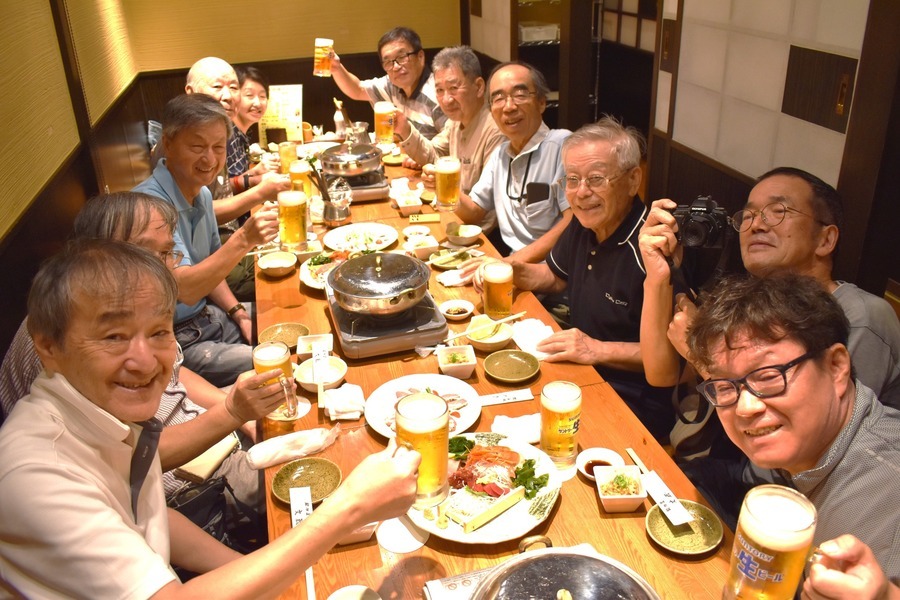 時は7月12日金曜日昼。還暦は云うに及ばず最早古希を過ぎ喜寿を迎えた後期高齢者14名、有楽町に参集暑気払い。大隅君が幹事を代表して挨拶、新保君が乾杯、安達さんが司会進行。歓談後近況を報告しあいました。1月に新年会を開いたので近況に変化がある筈もないと想像。豈図らんや話題が尽きることなく、時間が足りなくなりました。 今年後半の同期会は、10月16日に秩父三峯神社参拝農園ホテル一泊、12月6日(金)忘年会。