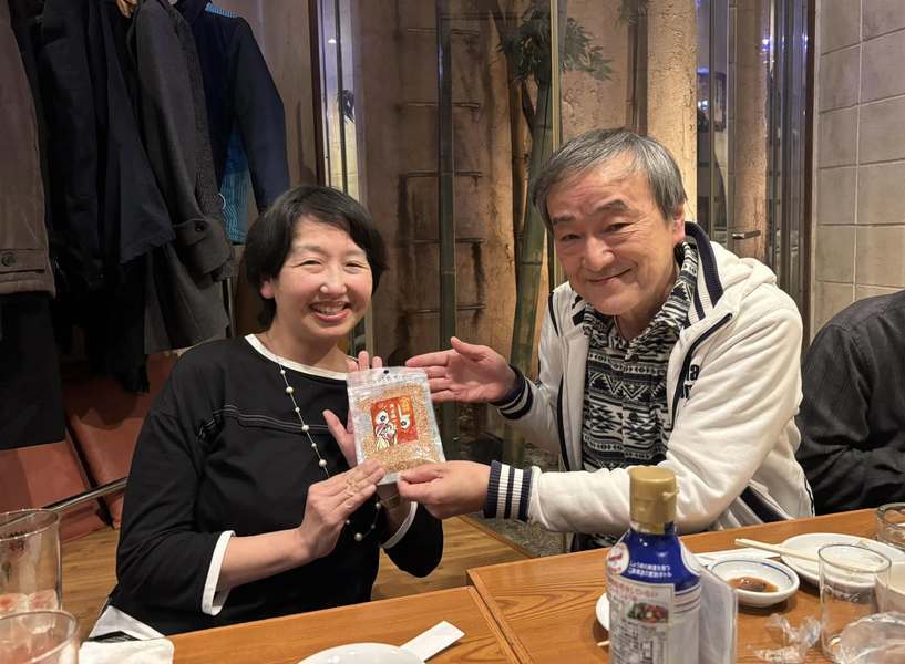 東京信陵会の鈴木会長が福島大学印の「お米のバウムクーヘン( https://b-kirari.shop-pro.jp/ )」が大量に売れ残っているのを見かねて、おなじみのじゃんけん大会を開催しました。 その後、参加者が買い求めたので、ある程度は在庫が捌けました。