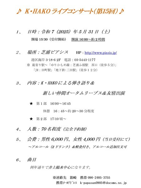 2025年5月31日に箱崎一彦氏(大23卒)のコンサートが開催されます。完全予約制ですので、東京信陵会の会員で鑑賞ご希望の方は事務局までお問い合わせください。