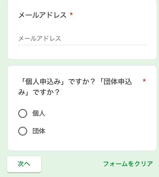 メールアドレス、「個人」/「団体」が必須です。団体からの派遣以外(交通費は自腹)は「個人」をご選択ください。「次へ」を押下。