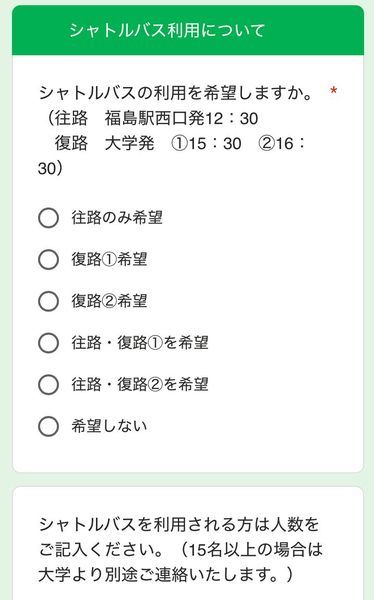 シャトルバスの希望が必須です。往路1便、復路2便、希望せずの6択。「次へ」を押下。