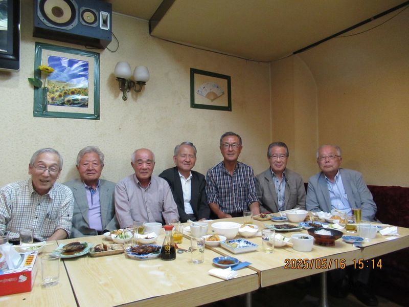 1) 2025年5月16日(金)12:30-15:00に渋谷の行きつけの「大衆パブ山形」に17回卒の8名の参加にて同期会を開催しました。幹事団(加藤孝雄/佐々木茂喜/田中克房/八鍬俊一/山本邦治)は関東中心の同期生約50名宛にEメール/SMSにて参加を呼びかけ、8名が参加。 参加者には①同期会開催履歴➁出欠者List③欠席者(17名)のメッセージが配られた。