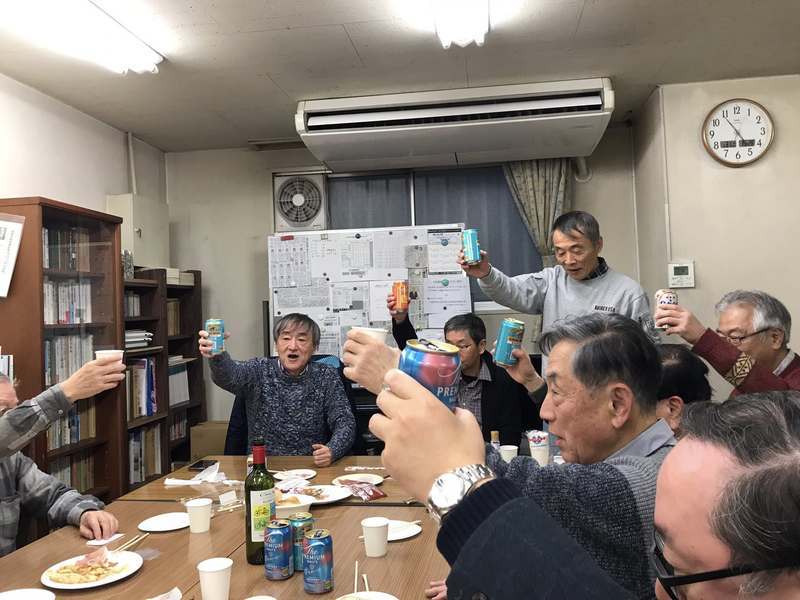 寒さが募る12月10日(水)昼有楽町、全員喜寿を迎える19回卒(昭和46年卒)15名が忘年会を催しました。遠くは宇都宮、北茨城、近くは文京区から参集。恒例の新保君の乾杯音頭取りで開宴。料理に舌鼓を打ちながら歓談、近況(自身の趣味身の回りのこと、故郷の話題、闘病体験、家族のことなど)を報告しあいました。 最後に来年の旅行概要について発表。 代表幹事は國乗君、志賀君、新保君の両君が幹事、アドバイザーとして寺島君。 日程は5月19日12時飯坂電車旧森合駅(現美術図書館前)集合、昼食後如春荘など近隣を散策、飯坂温泉祭屋湯左衛門に宿泊、5月20日9時解散、とのこと。 足元が明るいうちに閉宴解散。 離れがたい面々は寒空の中、二次会三次会と結句足元が暗くなるまで流れた模様。