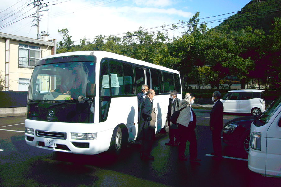 如春荘見学のあとは福島市南部の金谷川キャンパスに向かいました。今回は同窓生の手塚健一氏(大39)が社長を務めるウエディングエルテイがバスを手配、国道4号を南下し、車中では寮生活のエピソードなども出て、しばし回顧談を楽しみました。