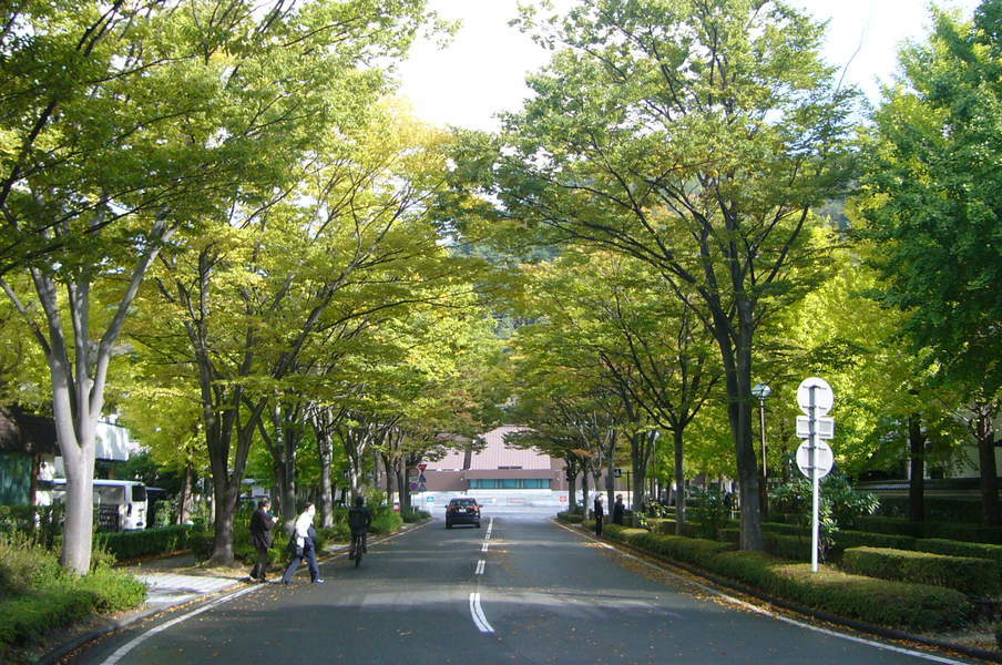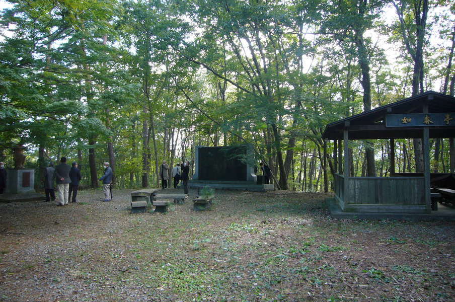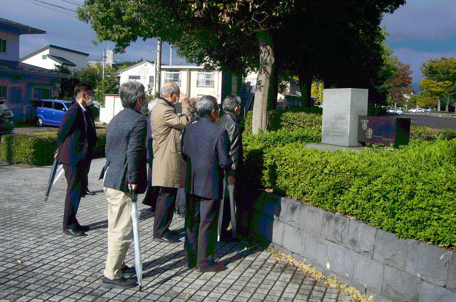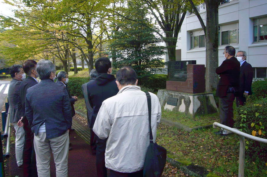 福島大学では、広大なキャンパスを巡り、まず福大経済60周年記念事業として造成した「信陵公園」に向かいました。公園には、戦没同窓会員慰霊碑、鎮魂わだつみ像、「如春亭」と名付けた四阿(あづまや)などが配置されています。この後、一行はグラウンドや図書館などを視察しました。