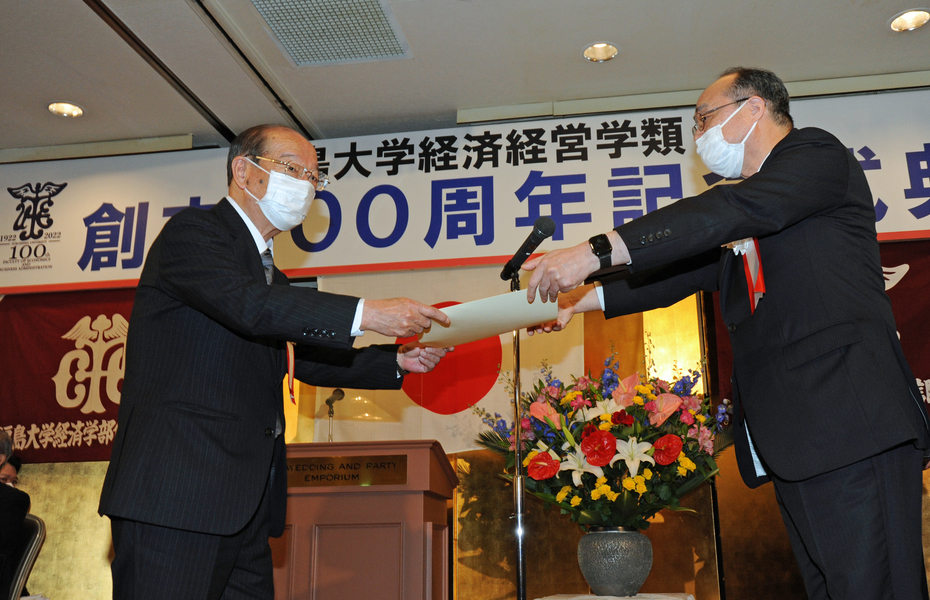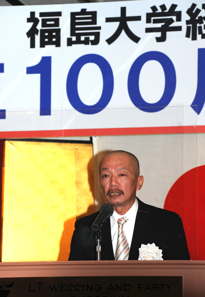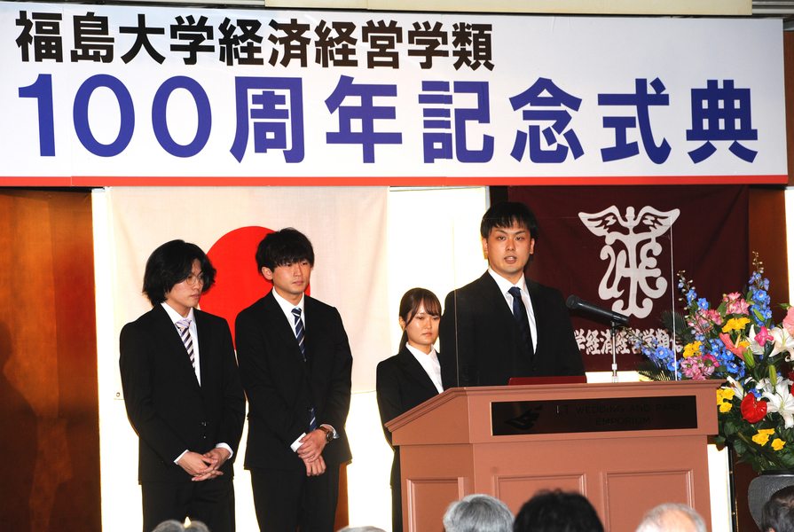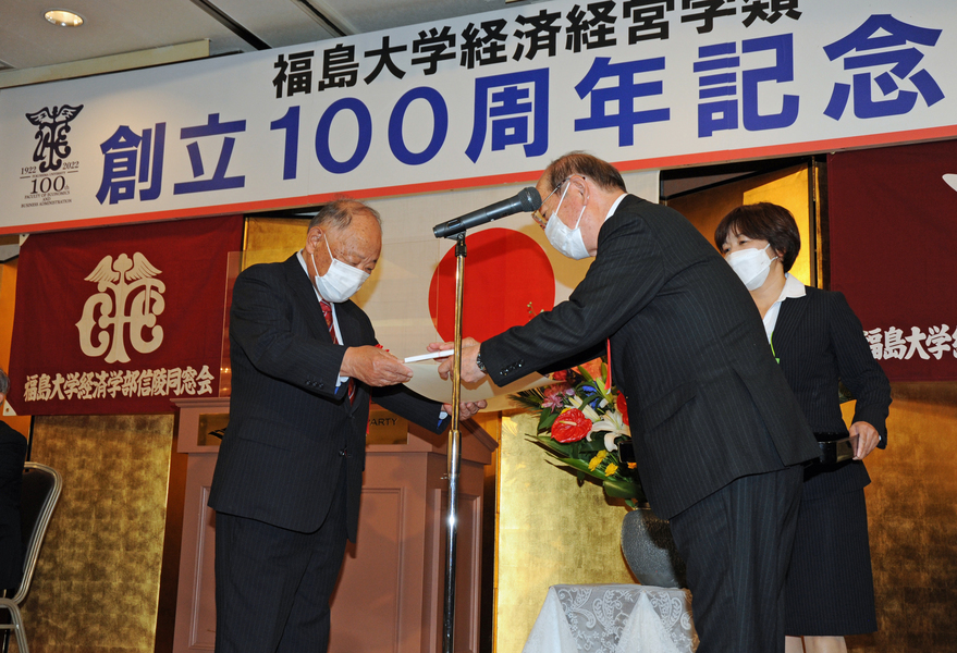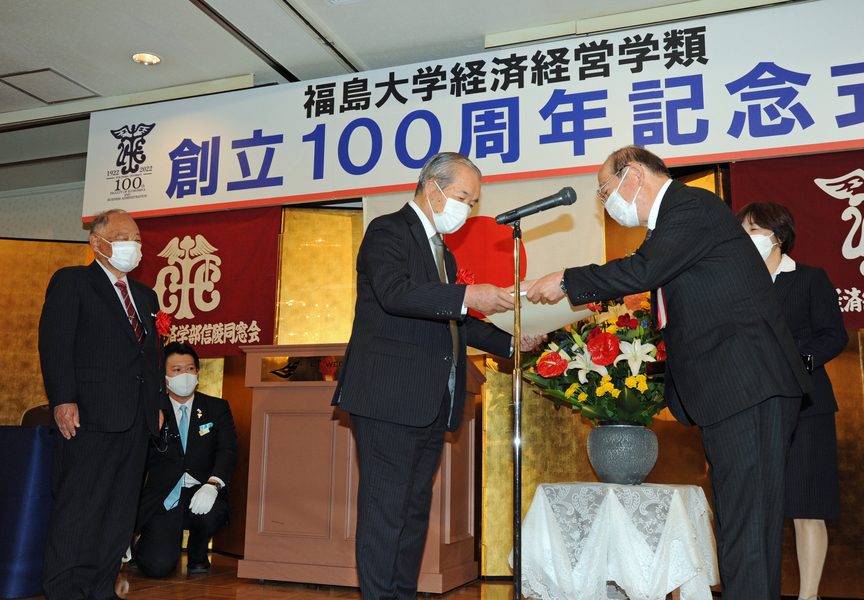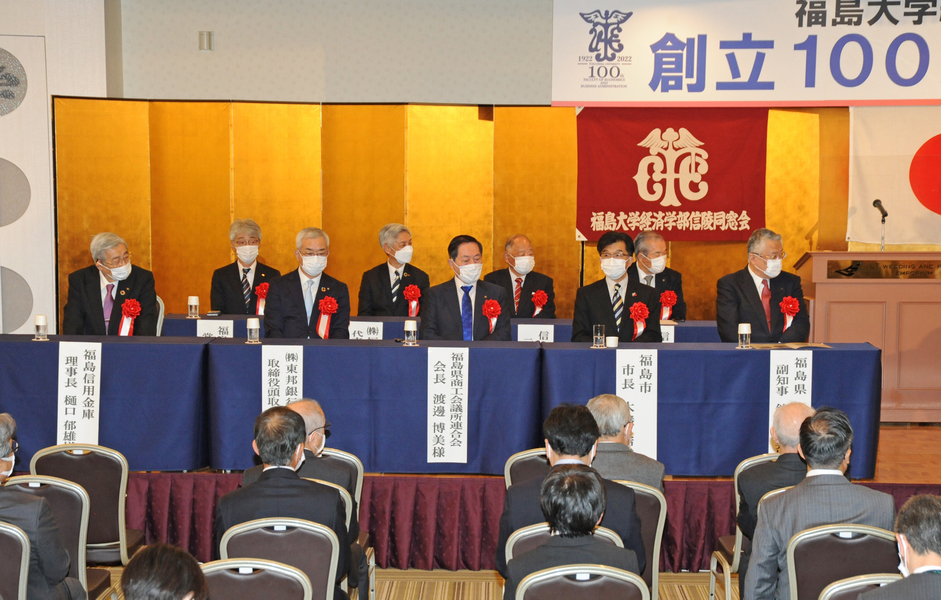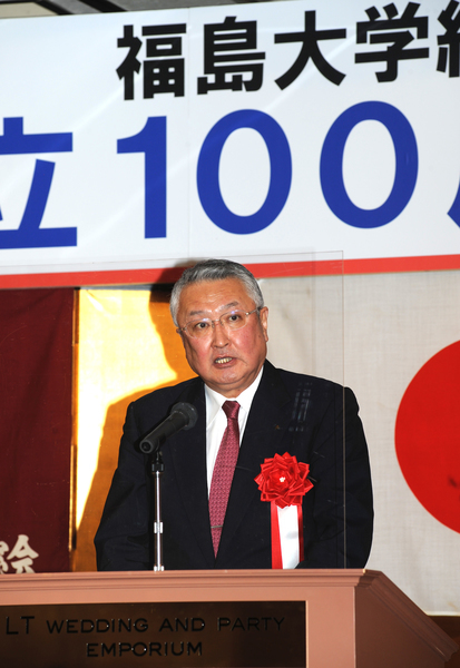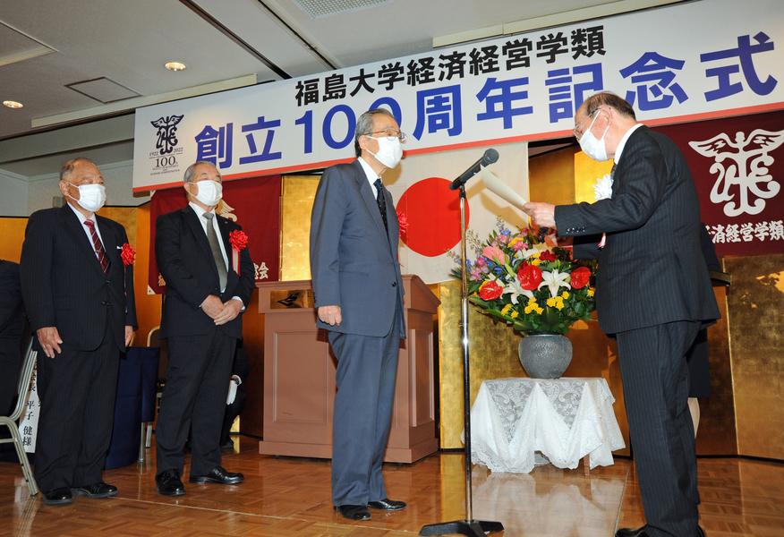 続いて三浦浩喜福島大学学長が「1922年の開校から創立百周年を迎えられ、本日、式典を開催されましたこと、心よりお祝い申し上げます。大正、昭和、平成、令和と強いエネルギーで乗り越えてこられました。1981年に金谷川への新キャンパス移転が完了し、大学は2学部が5学類になりました。伝統と革新による自己変革に期待しています」と挨拶。続いて末吉健治経済経営学類長が「各界で活躍されている卒業生の皆様、在校生とともに百周年をお祝いしたいと思います。本学はグローバルな視野を持ち、地域で活躍する人材の育成とアクティブラーニングを進めております。百年の伝統あっての改革の歴史であり、今後ともご支援をお願いいたします」と述べました。