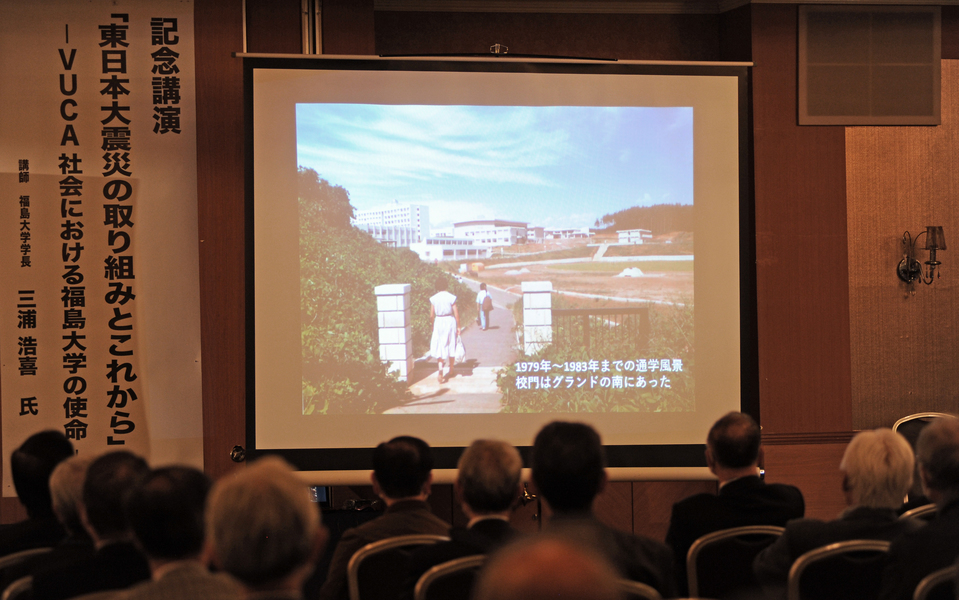 記念演奏会に続いての記念講演会では、三浦学長が「東日本大震災後の取り組みとこれからーVUCA社会における福島大学の使命」と題して講演しました。三浦学長は森合から始まり、金谷川移転後の母校の歴史をたどりながら、東日本大震災における大学が果たした多くの役割について話しました。VUCAはVolatility(予測不能)、Uncertainty(不確実)、Complexity(複雑性)、Ambiguity(曖昧性)の英語の頭文字をとり、予測が困難な時代を表す言葉で、三浦学長はコロナ禍、ウクライナ紛争、円安など現在の状況と気候変動、巨大地震、人口減少など今後の対応すべき課題を挙げ、今こそ改革が求められていることを強調しました。
