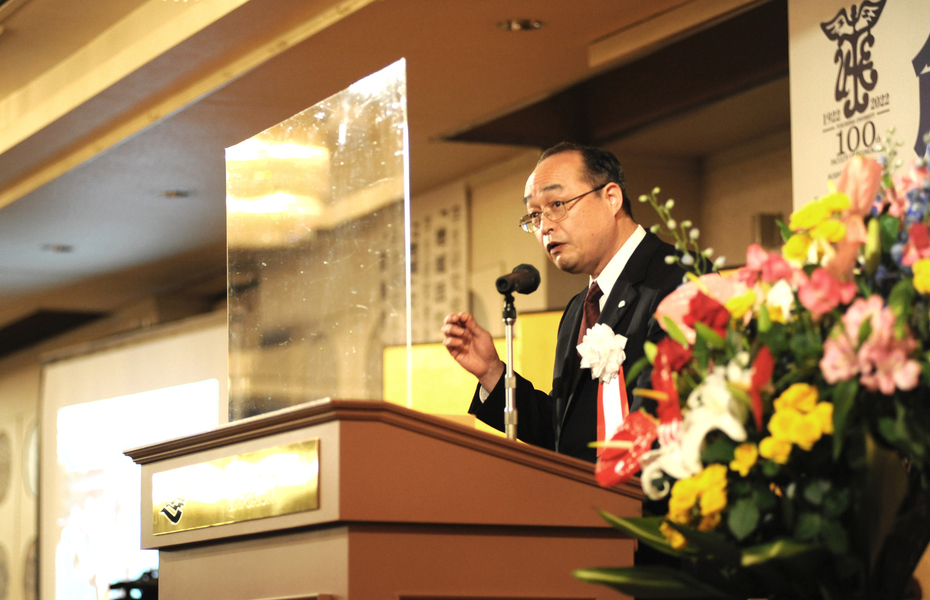 物故会員へ黙祷を捧げ、大会会長の佐藤慶吾信陵同窓会長(大学18回)が式辞を述べました。佐藤会長は「コロナ禍のなか、創立百周年記念式典が開催できましたことは誠に喜ばしく、皆様方とともにお祝いしたいと思います。信陵同窓会は母校と一体となって取り組んできました。キャッチコピーは『百年の伝統と未来への革新』です。記念事業のメーンである『福大経済100周年基金』充実のためにたくさんのご支援ご協力をいただきました。 心から厚く御礼申し上げます。福島大学経済経営学類の新たなスタートと大学の益々の発展を祈念いたします」とあいさつしました。
