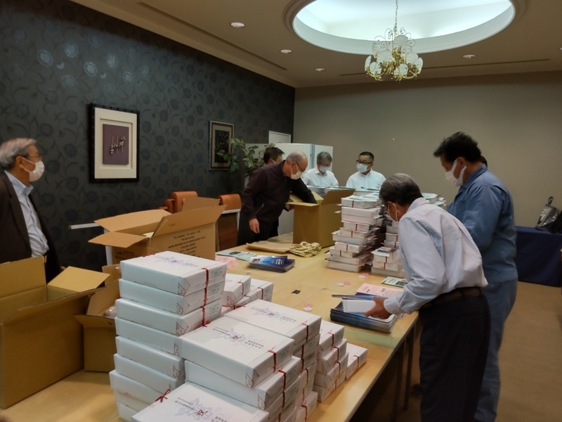 式典を翌日に控えた10月28日、同窓会役員と大学職員が会場に集結、パンフレットと記念品である菓子の詰め合わせを袋詰めしました。菓子は福島市が生んだ国民的作曲家・古関裕而ゆかりの「福島夜曲」「ハモンドの調べ」と名付けた品。古関裕而は福島高商の校歌「世界の転機に」の作曲者であり、ゆかりの品として選定しました。