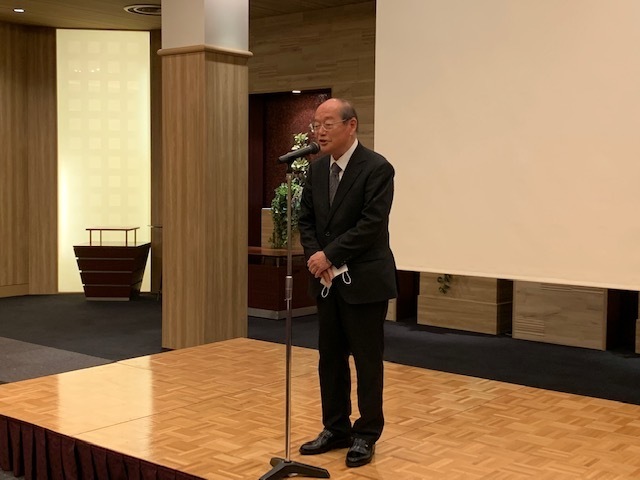 会場では記念大会の模様を収録したビデオが流され、10月29日開催の記念式典・吹奏楽団演奏会・記念講演会を振り返りました。佐藤慶吾大会会長が「コロナ禍という大変な状況のなかで大会を開催しましたが、350人に来ていただきました。無事に終了出来たのは皆さんのおかげです、各担当がしっかり役割を果たしていただきました。今回はメディアにも感謝します。新聞に連載記事を掲載、百周年事業を周知いただきました」とあいさつしました。