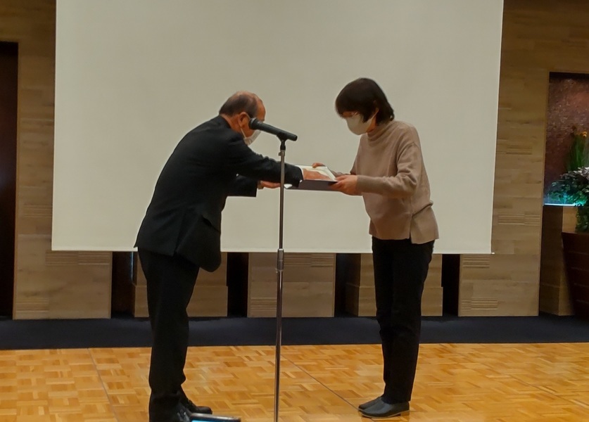 このあと同窓会事務局に平成16年6月から勤務し、日常の業務に加えて、今回の創立百周年記念事業の事務作業に貢献した高橋礼子さんに佐藤慶吾会長から感謝状が贈られました。