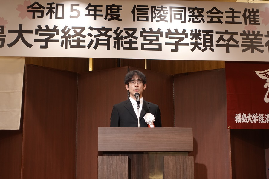 大学39回の手塚健一氏(ウェディングエルティ社長)が司会を務め、スムーズに進行。信陵同窓会副会長の菅野建二福島信陵会会長(大学21回)が開会の言葉を述べ、佐藤慶吾信陵同窓会会長(大学18回)が「皆さん卒業おめでとうございます。久々の祝賀会を開催することができました。社会にはばたく皆さんの活躍を心よりお祈りします。同窓会は全国に支部があります。大いに先輩を頼ってください。皆さんを応援します」と挨拶。続いて来賓の三浦浩喜学長、井上健学類長が挨拶しました。
