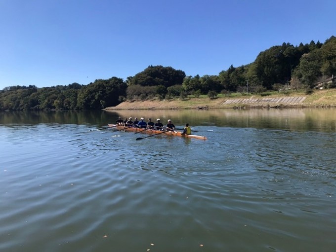 翌13日(日)は快晴に恵まれ、希望者が旧合宿所(阿武隈川漕艇場)に集合し、エイトを艇庫から出して水に浮かべました。体力的に自信がある、と宣言していた8人が乗艇。漕手8人とコックス(舵手)を乗せた艇は、事前の整備もあって、何とか沈むことも無く、静かに川面を進んで行きました。上空には、エアレーサーの室屋さんと思しき飛行機が旋回しながら飛んでいて、まるでエイトにエールを送っているかの様でした。乗艇後は、皆んなで豚汁とビールを味わい、前日に続けて楽しい会となりました。